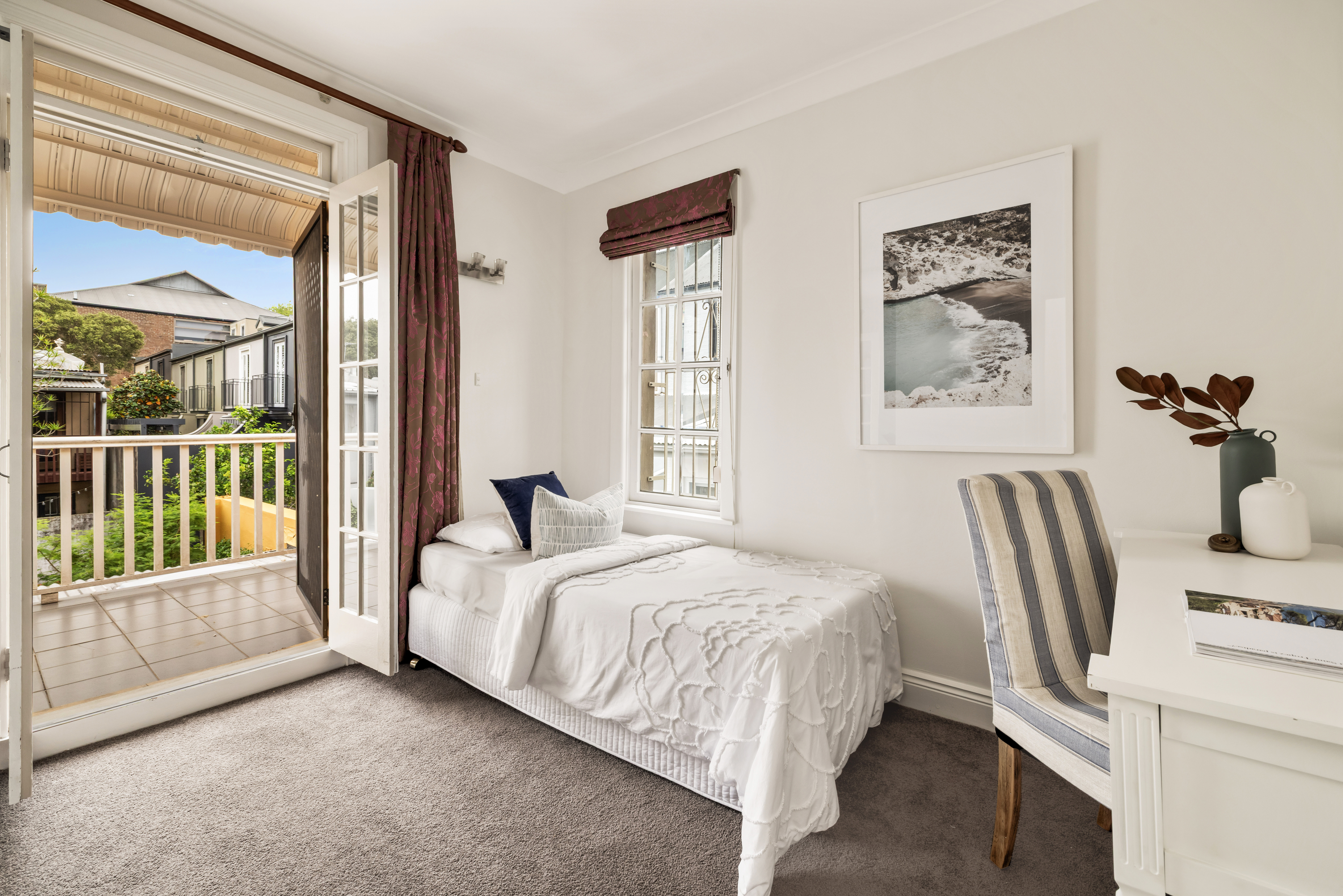- French doors open to sun bathed courtyard