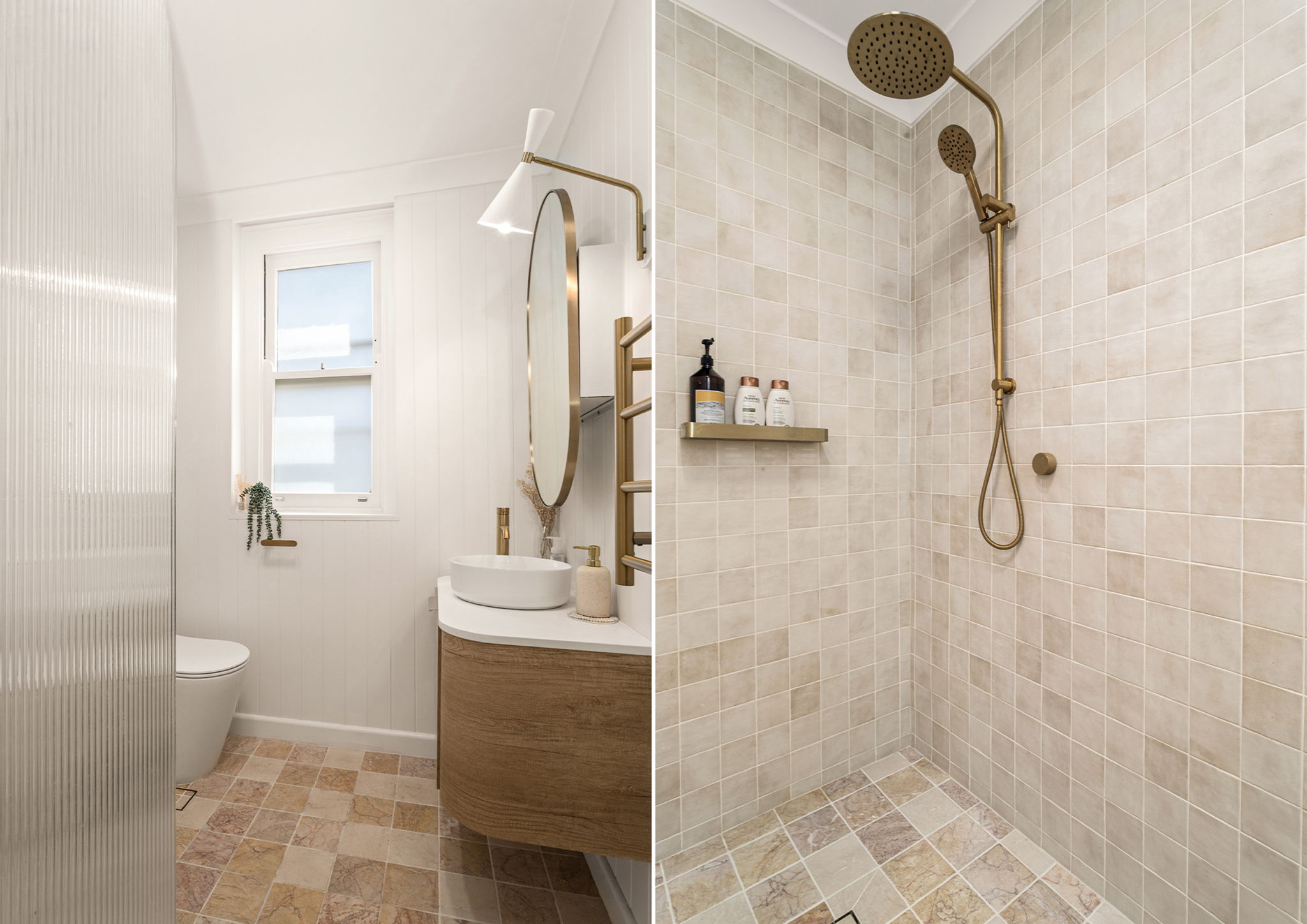 - Brushed gold-tapware, ceiling fan, sheer curtains