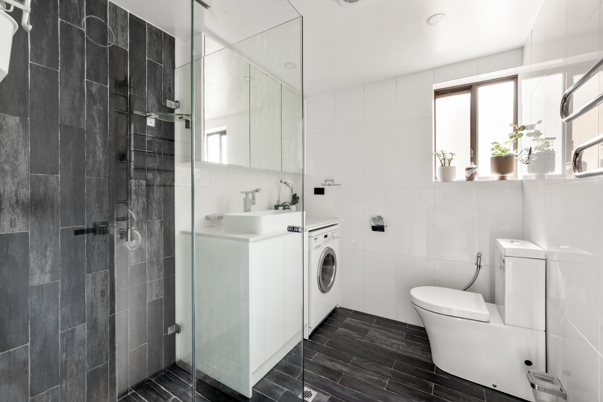 - Stylishly updated bathroom has heated towel rack