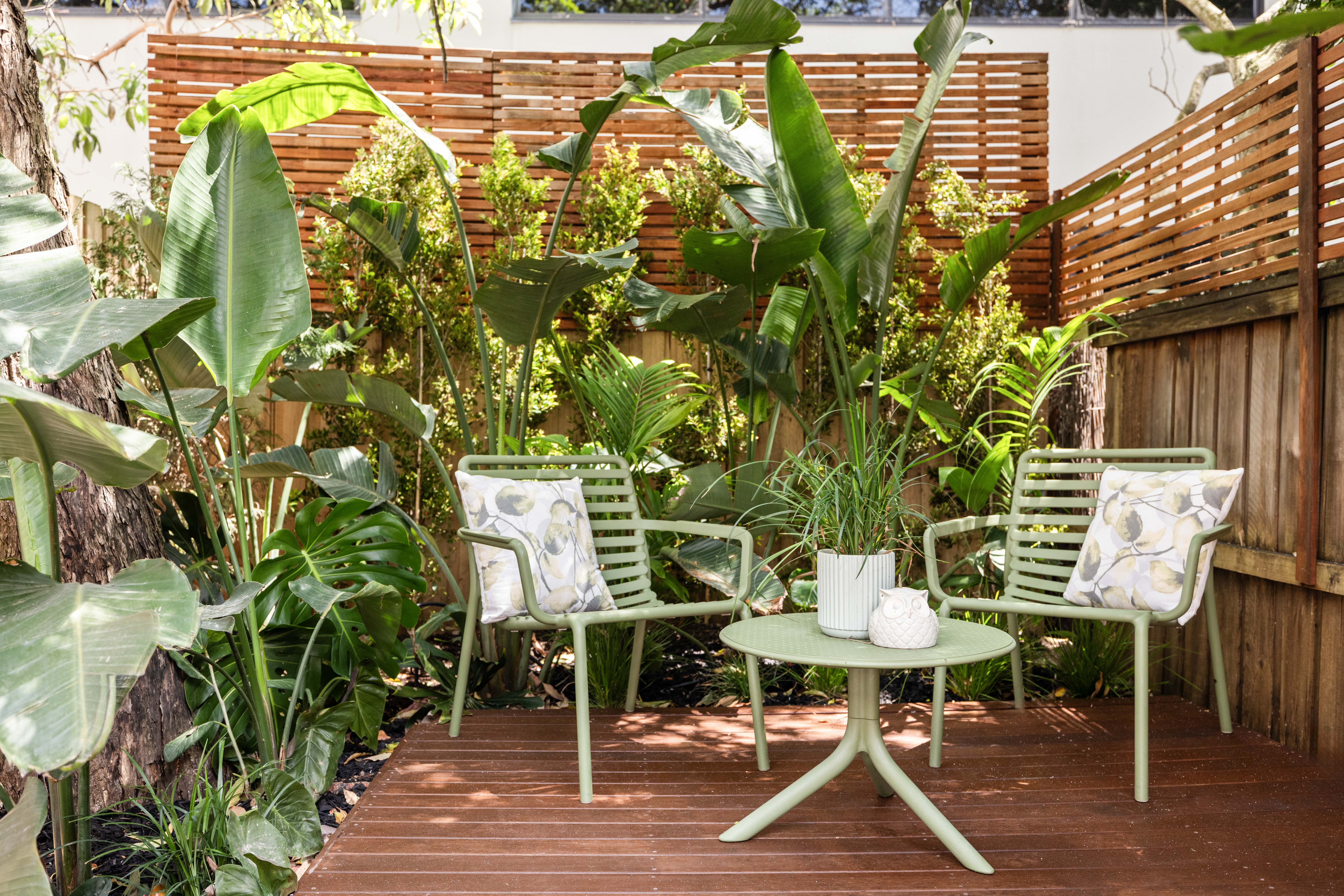 - Established trees shade part of the sunny deck for outdoor relaxation