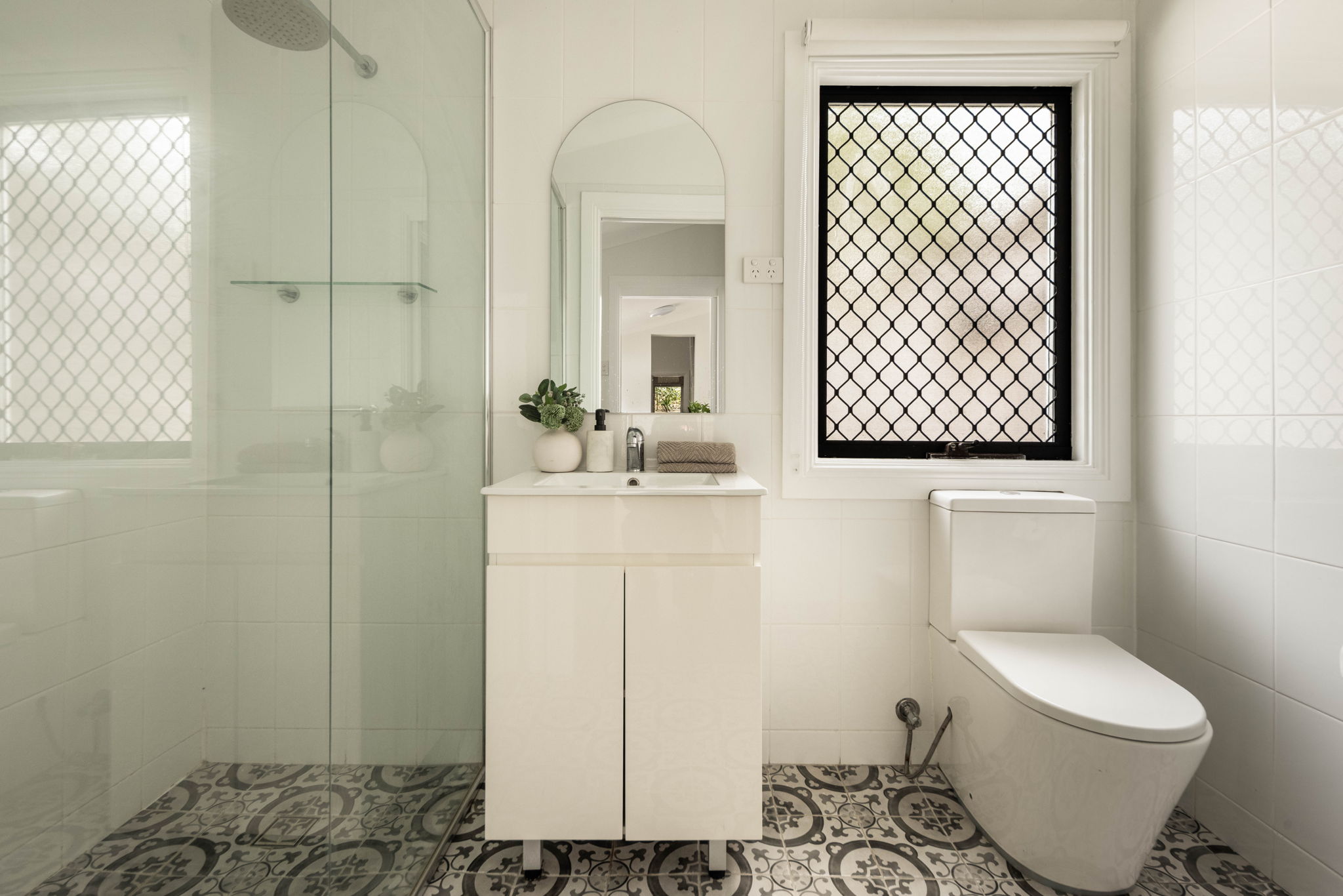- Renovated bathroom with a lovely patterned floor