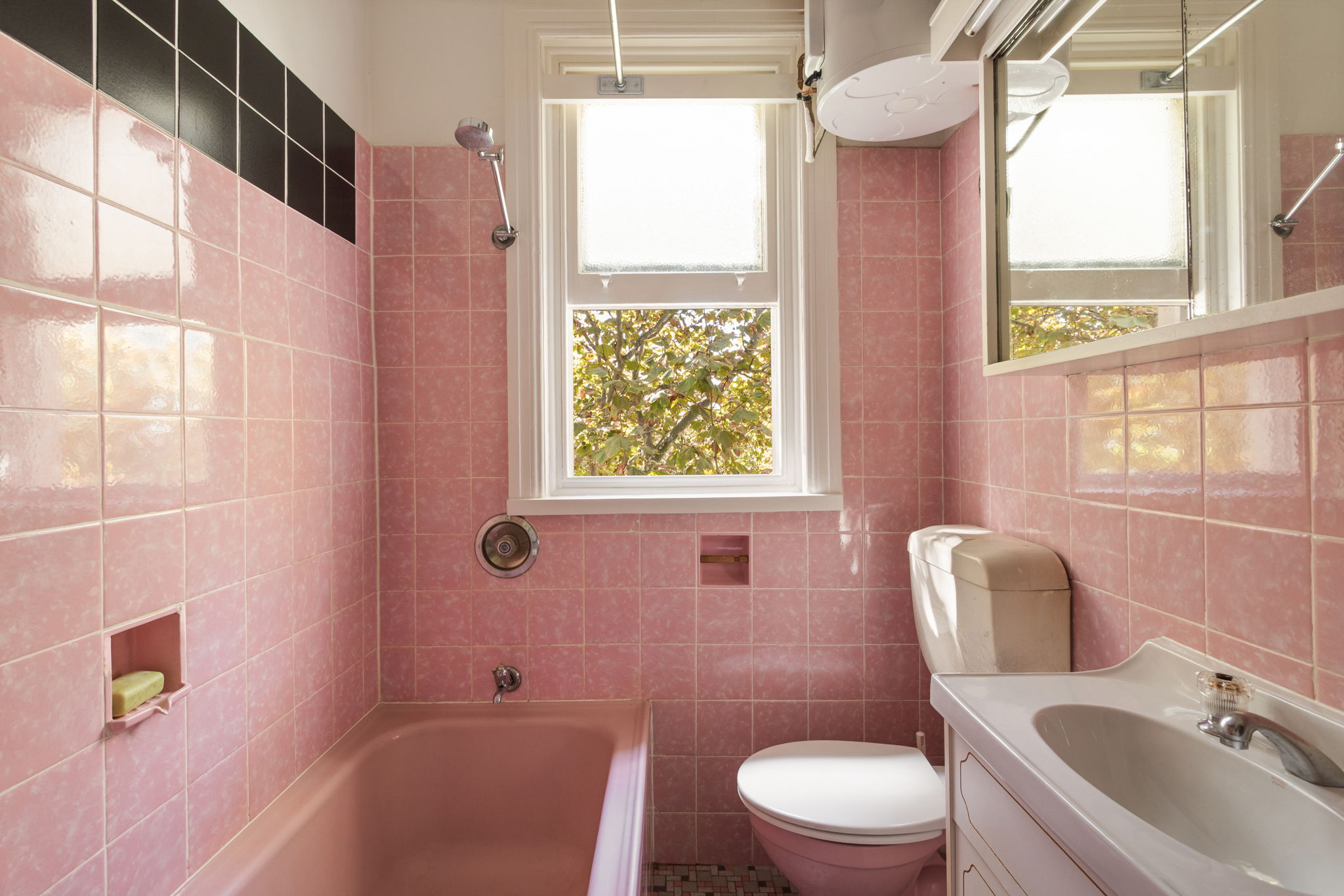 - Original pink bathroom with bath over shower