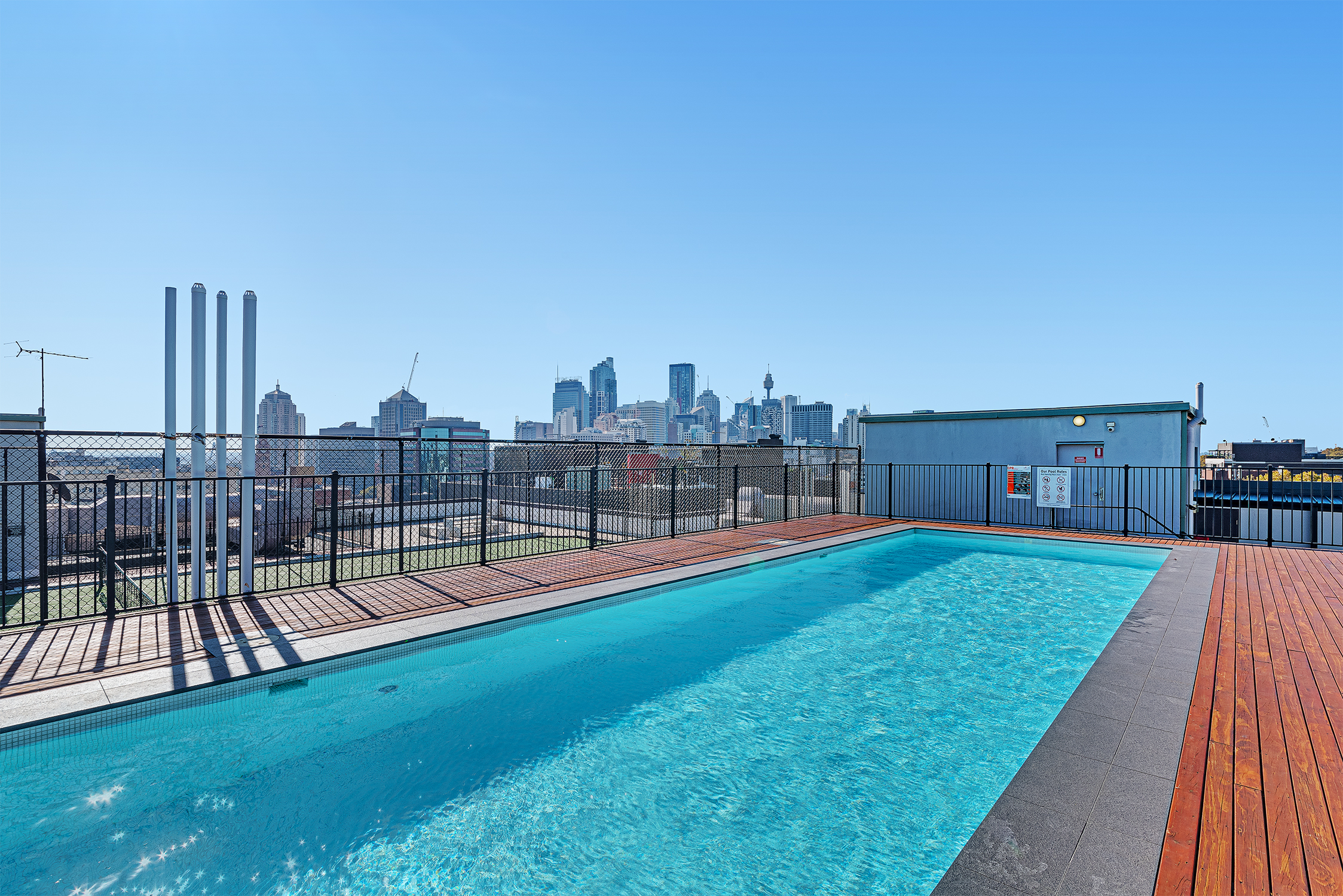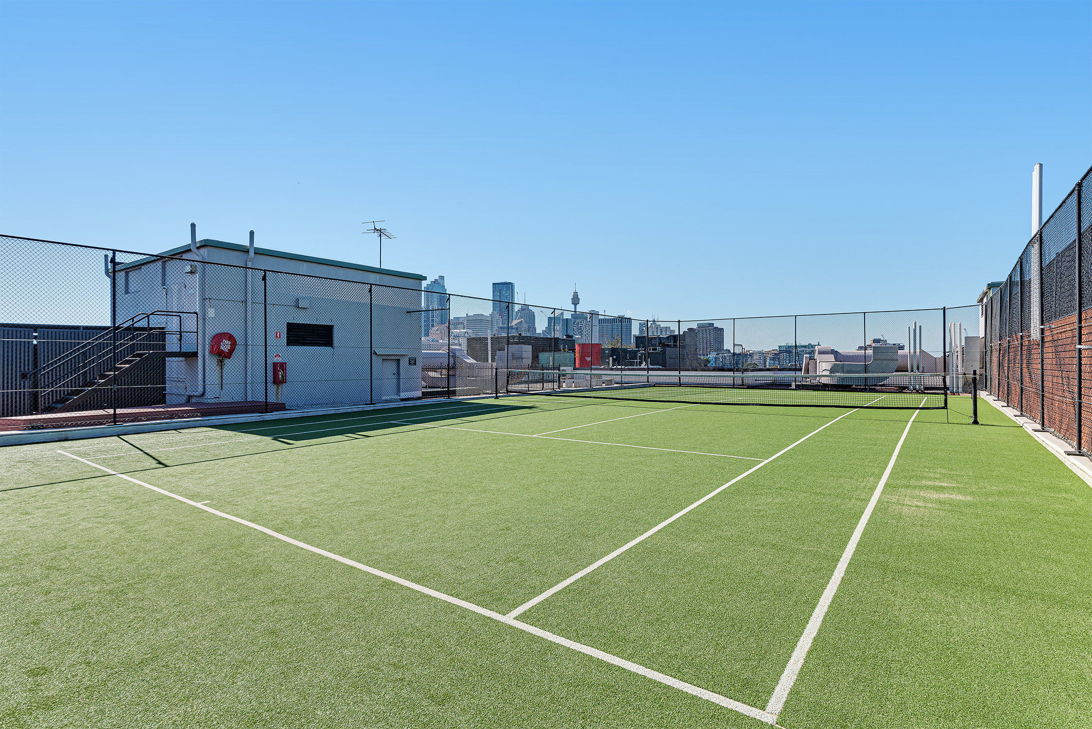 - Rooftop pool, tennis courts with city skyline views