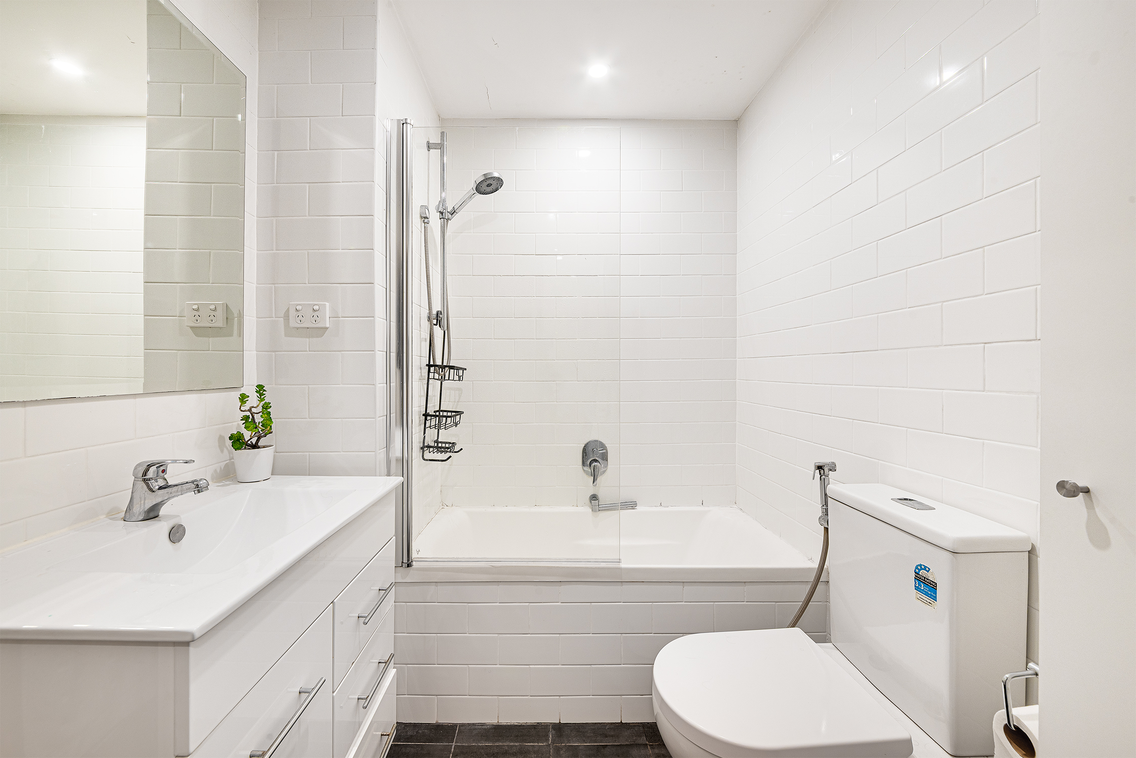 - Full white bathroom with bath tub & internal laundry