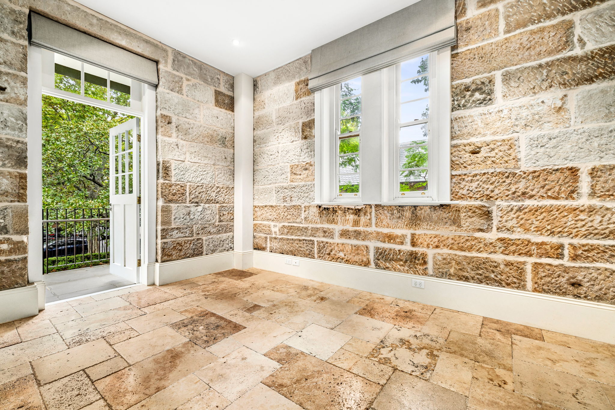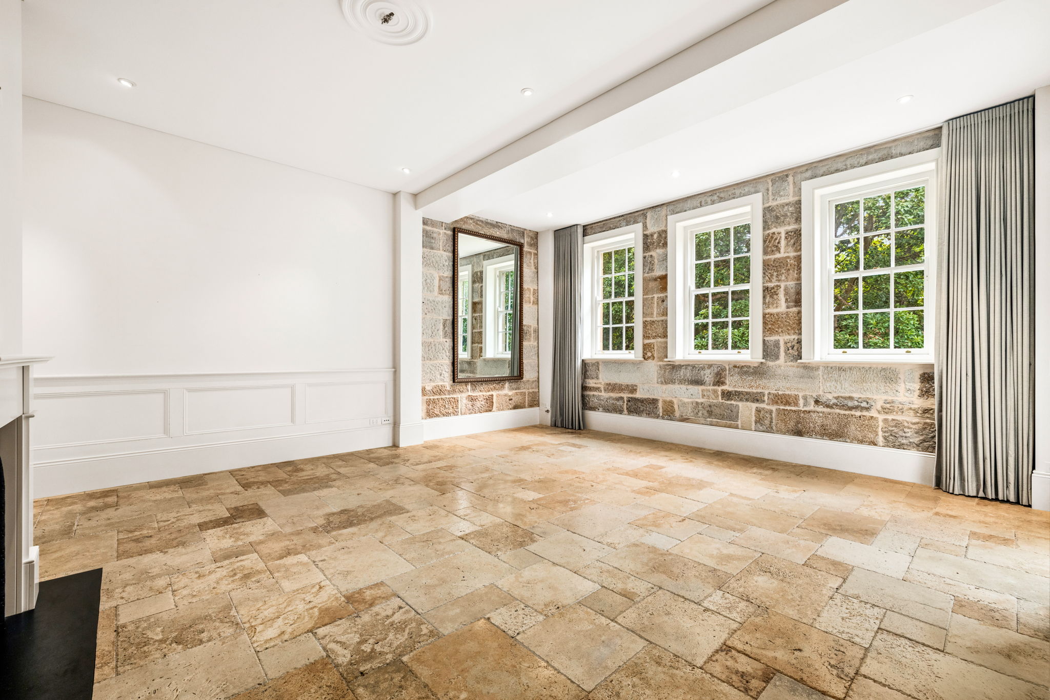 - Travertine flooring, heritage sandstone, cashmere curtains