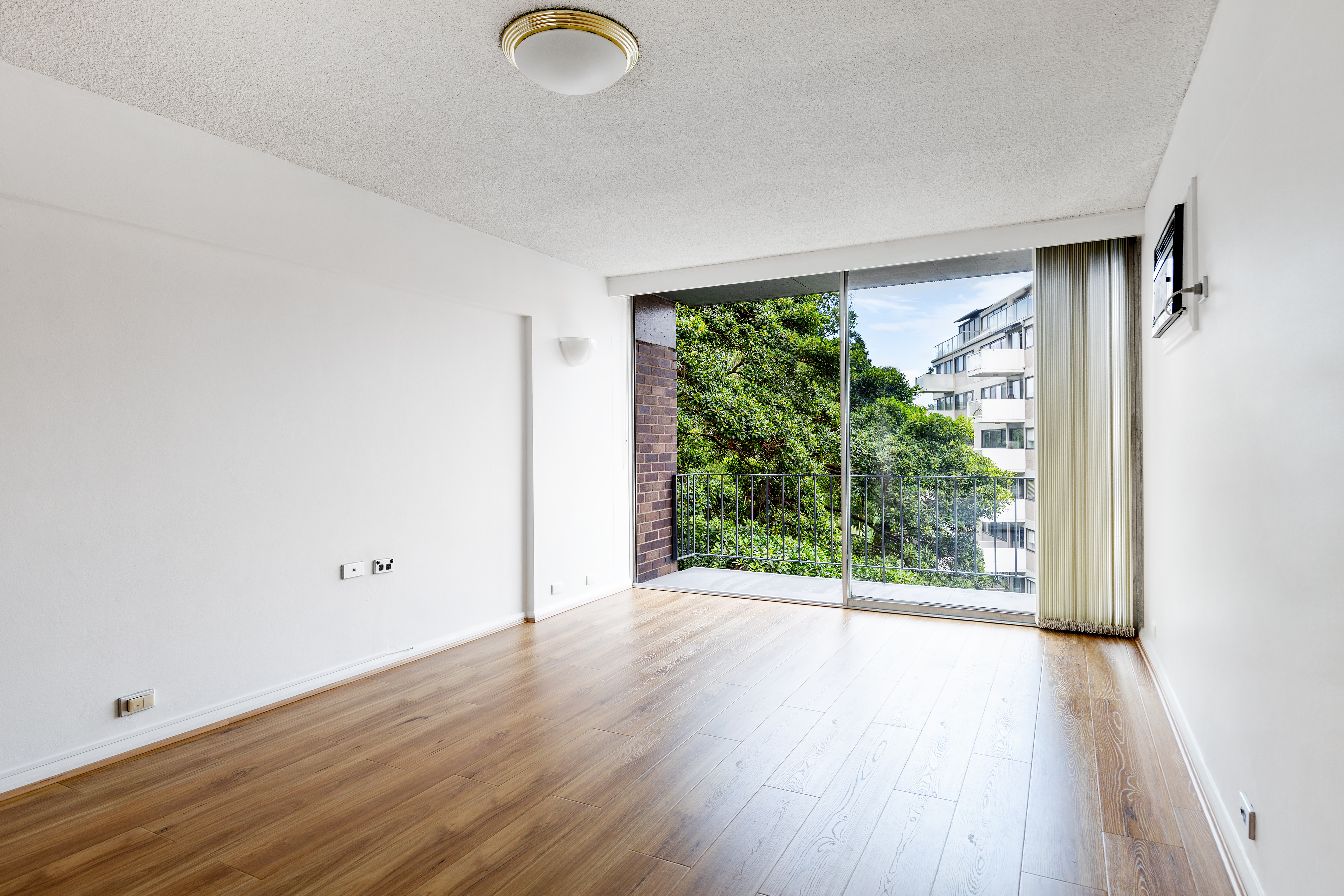 Set in a jacaranda-lined avenue with 200m stroll to harbour side Rushcutters Bay Park, this tranquil studio enjoys leafy outlooks from wall-to-wall balcony glass door in an elevated setting on level 4 of a modernist c1960s building with central atrium, and lift.