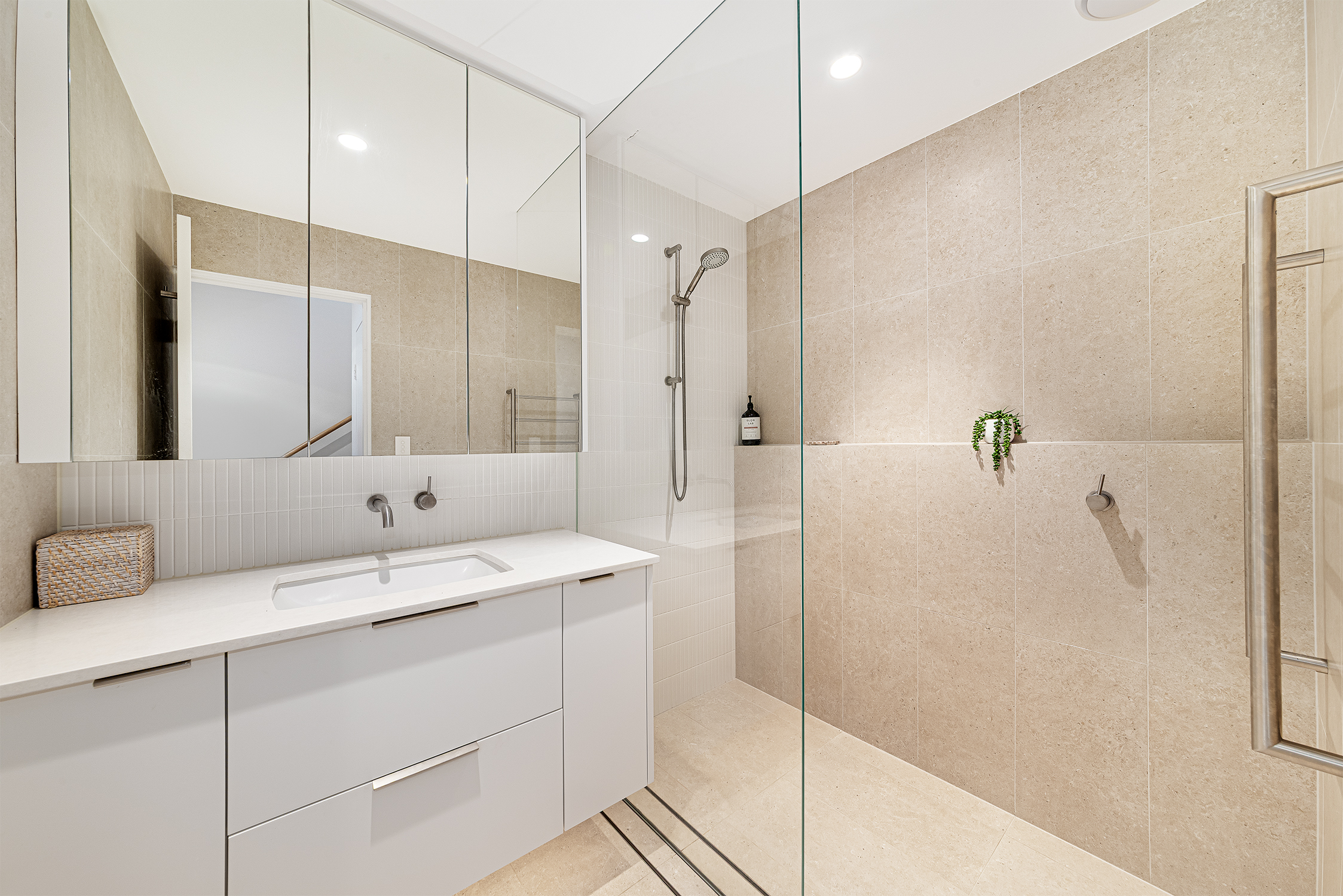 - Sophisticated modern bathroom with underflooor heating + heated towel rail
